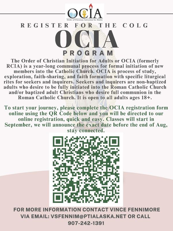 The Order of Christian Initiation for Adults or OCIA (formerly RCIA) is a year-long communal process for formal initiation of new
